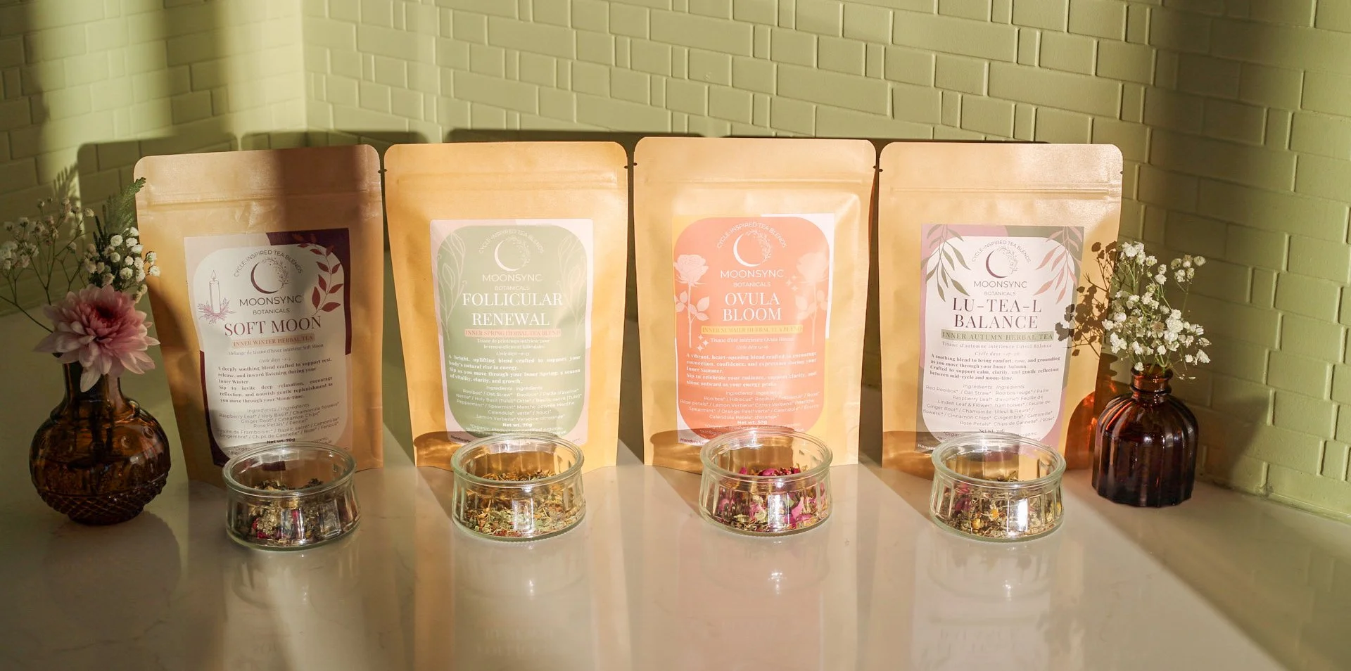 MoonSync Botanicals creates herbal tea blends designed to support the menstrual cycle. Each blend is crafted to align with one of the four phases of your cycle, helping you feel more balanced, supported, and connected to your body and the inner season.